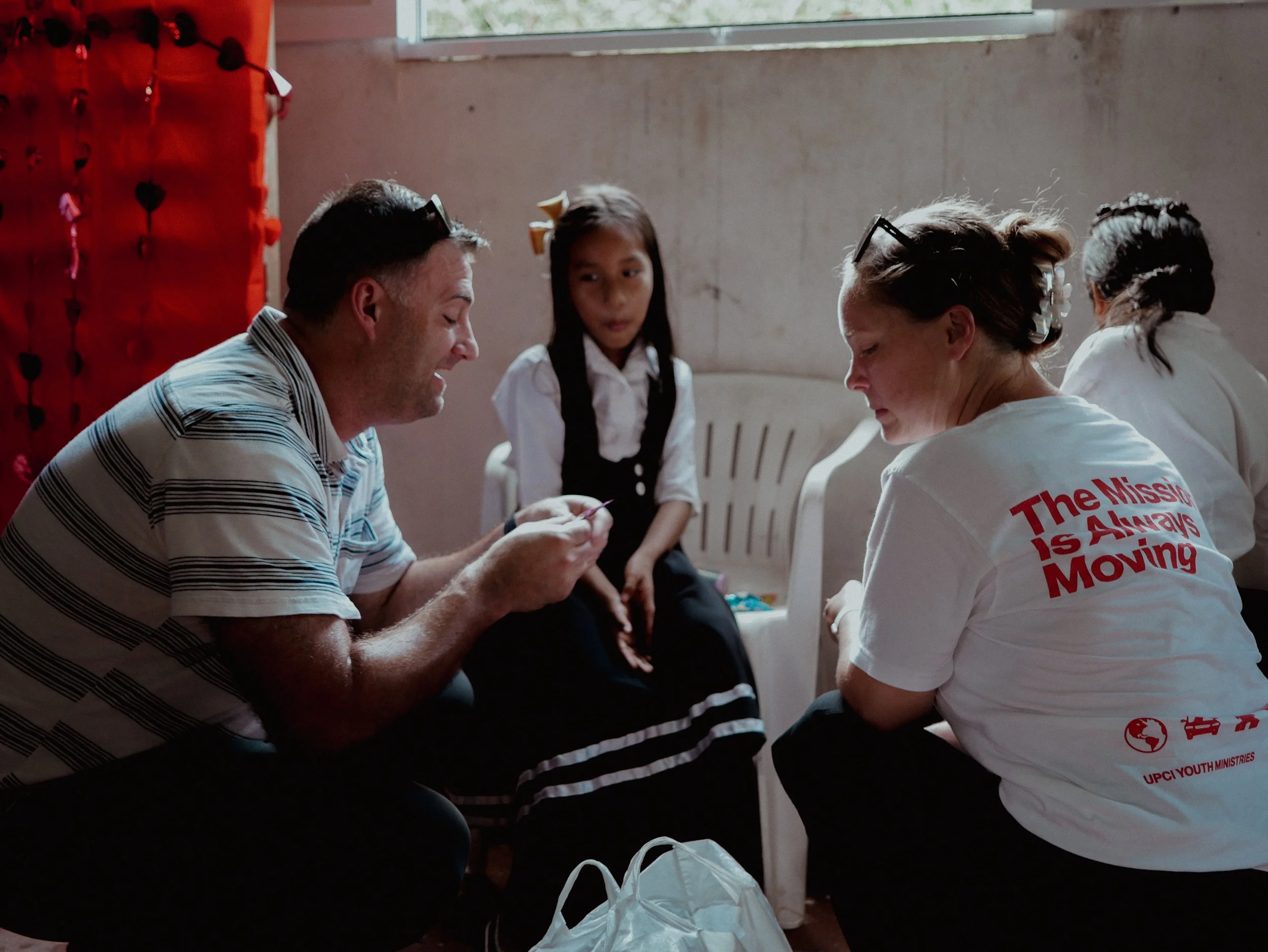 Two adults and a girl sitting together indoors, engaged in conversation, with the girl listening attentively. The woman wears a white T-shirt with red text that says 'The Mission is Always Moving' and 'UPCI Youth Ministries.' The man is wearing a str