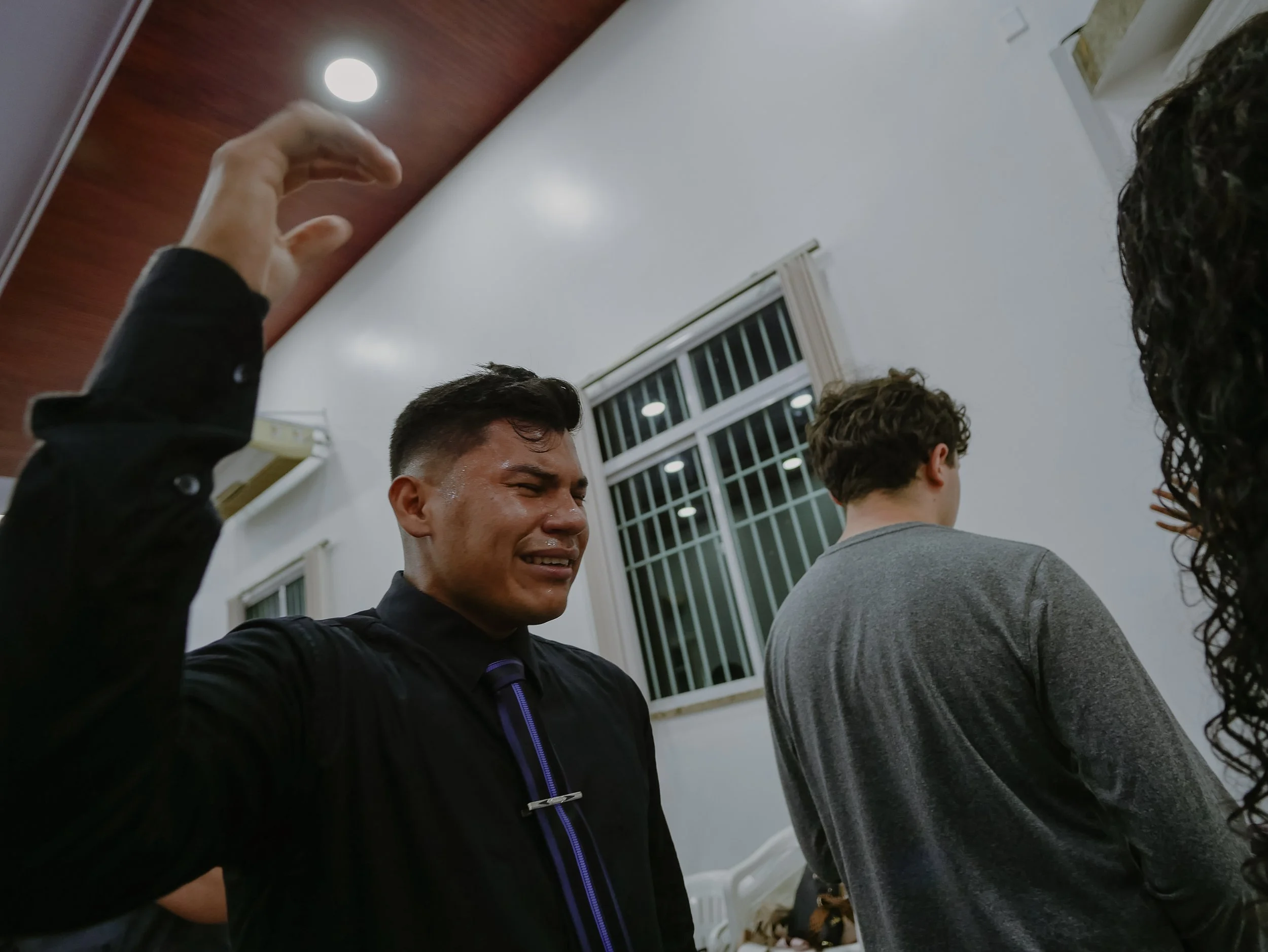 A group of people in a religious gathering, with some exhibiting emotional expressions, inside a building with metal roofing.