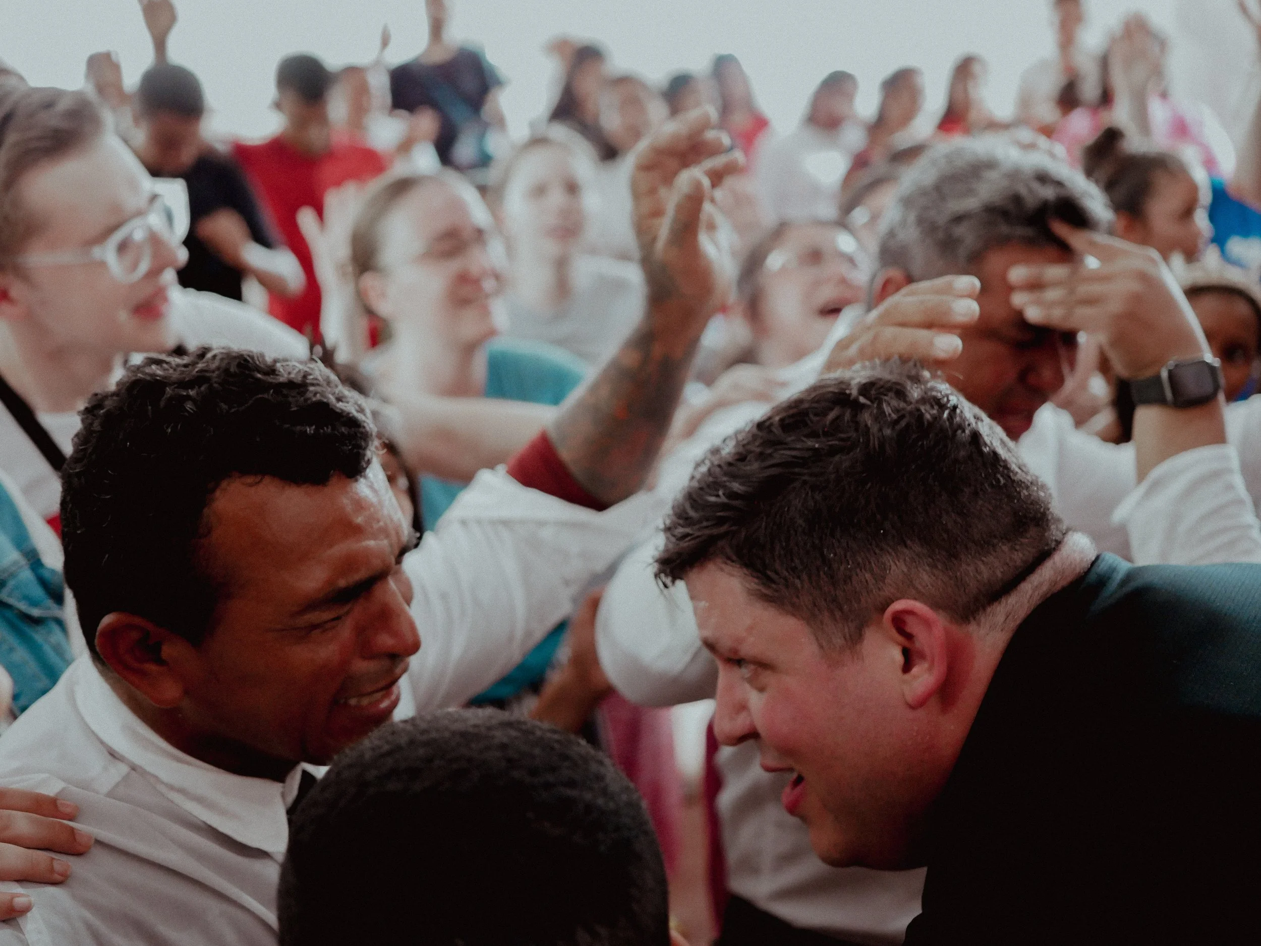 A crowd of people, some with emotional expressions, gathered at an event, with two men in the foreground appearing to be in a moment of intense emotion and engagement.