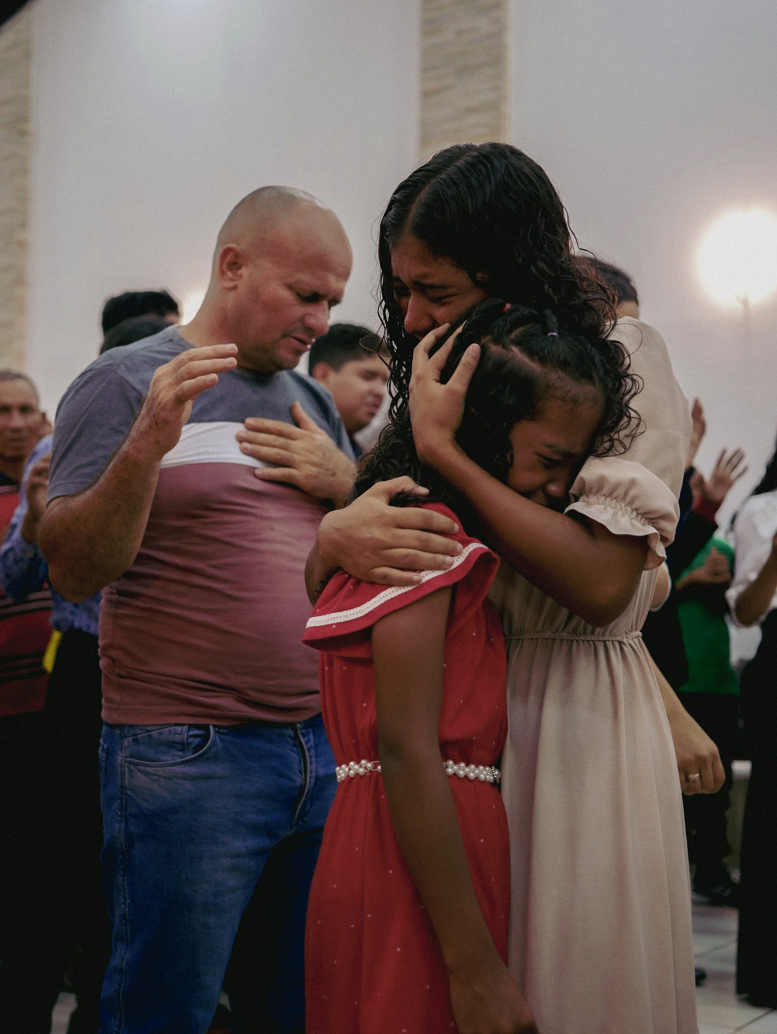 A group of people praying and mourning in a church, with a woman and a girl embracing at the center, showing deep emotion and grief.