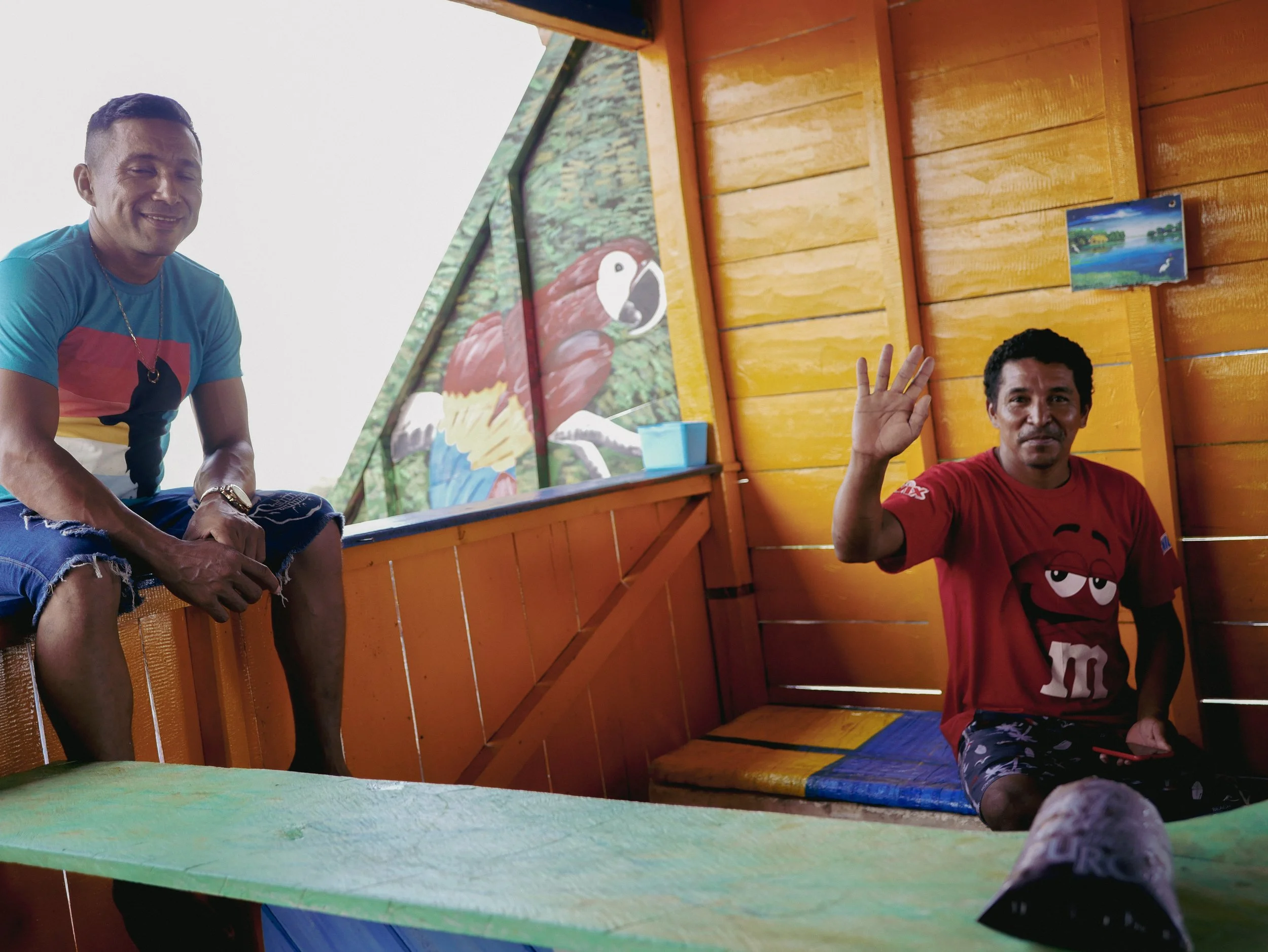 Two men inside a wooden hut, one sitting on a bench and waving at the camera, the other sitting on a colorful bench and smiling. The hut has bright yellow wooden walls, and colorful artwork, including a painted parrot, decorates the walls.